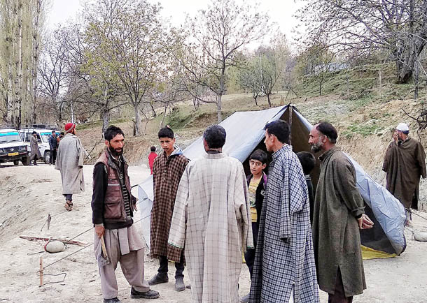 The villagers in protest against the government have erected a tent to block the road leading to Mini Hydro Power Project Branwar.