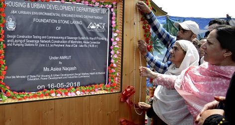 SRINAGAR, MAY 16: Minister of State for Housing & Urban Development, Social Welfare, Health & Medical Education, Asiea Naqash today laid a foundation stone for construction of a sewerage system around left areas of Dal Lake