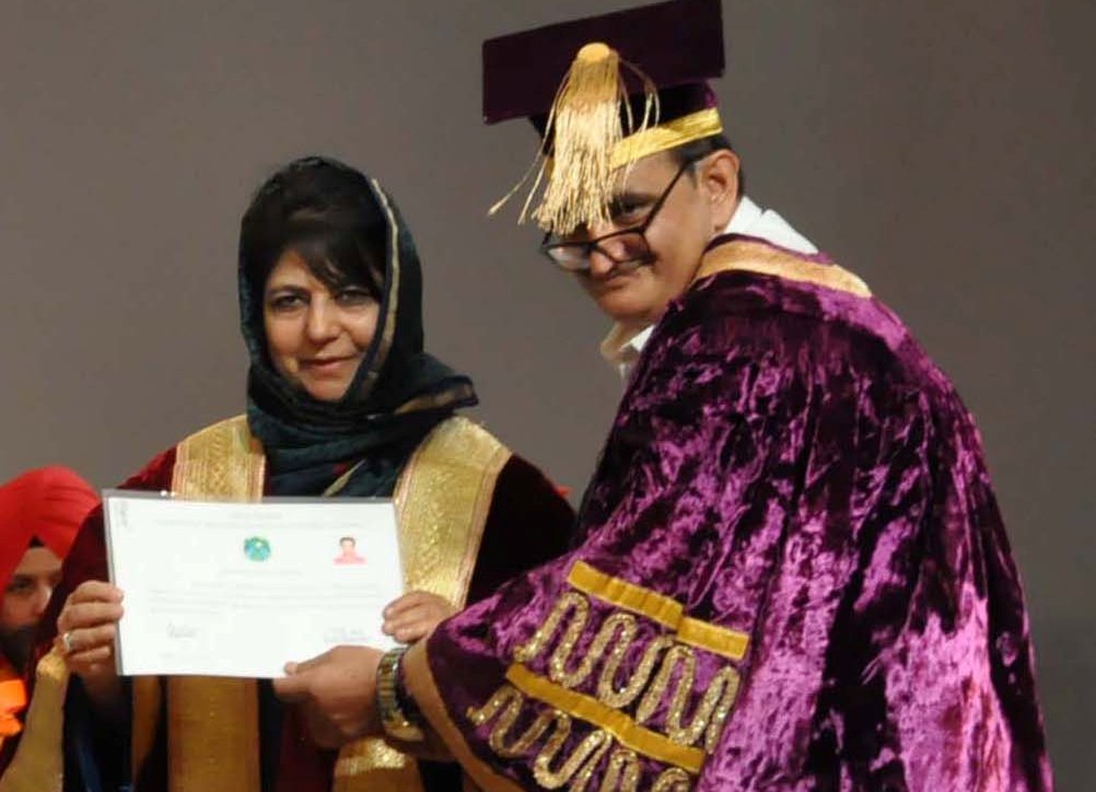 Mehbooba Mufti asked the students to adopt agriculture and allied activities as an entrepreneurial sector which would not only provide them individual jobs but also strengthen rural economy. “Look at West, how cool it is to be a farmer there”, she told the young agricultural graduates. “What does our State not produce. Some of the best cereals like Mushkabudji and Basmati Rice, dry fruits like Walnuts and Saffron”, she said and advised agricultural graduates to adopt farming as an enterprise in which they can showcase these unique varieties to exploit the global market.