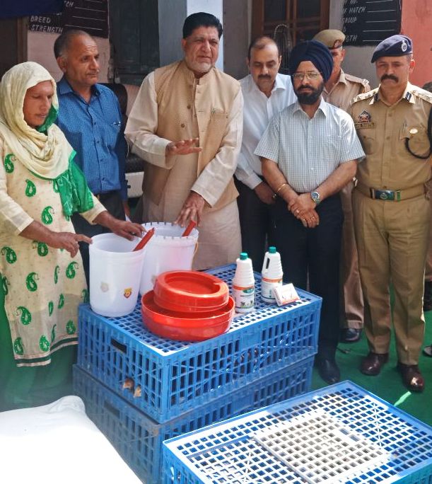 SAMBA, JUNE 02: Minister for Animal Sheep Husbandry and Fisheries today distributed 200 birds (chicks), 25 bags of maize, medicines and feeder bottles among 18 beneficiaries of National Live Stock Mission (NLM) – a central government scheme.