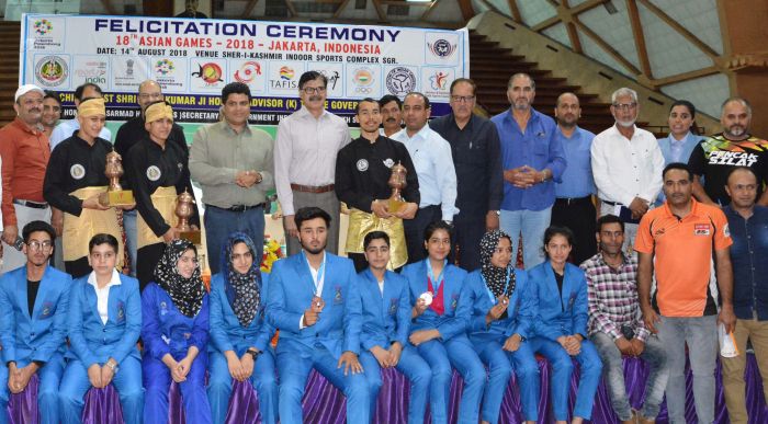 The advisor presented mementos to Simran and Sonia from Haryana representing India in Artistic event (doubles), Silver Medal winner NaoremBaynao Singh from Manipur, Coach Mohammad Iqbal and Irfan Aziz Butta, Water Sports champion Bilkees Mir, Atul Pangatora (Taekwondo).