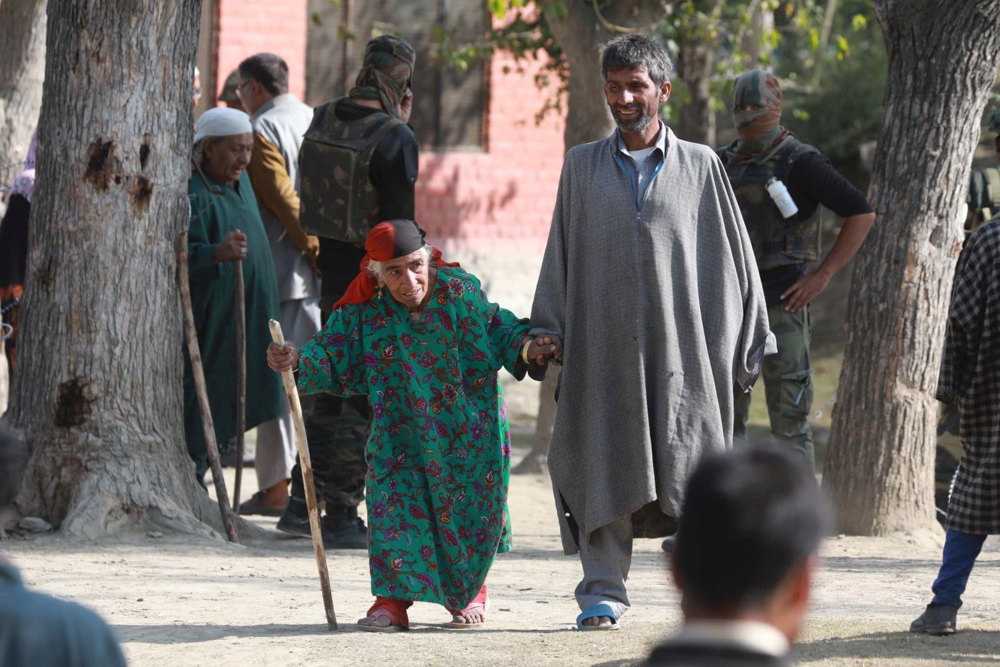 An elderly lady being helped and assisted by one of her family members to reach the polling booth to cast vote at Sumbal in Bandipora district. Photo/Javed Khan
