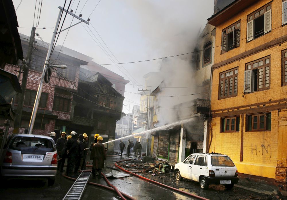 Fire-fighters trying to douse the fire at the encounter site. Pic/ Javed Khan