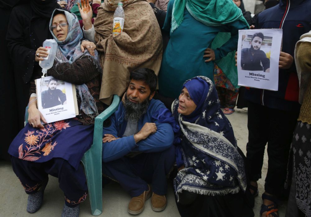Srinagar, November 1: Family members of Ahtisham Bilal, a student of a private university in Greater Noida, who went missing few days ago from New Delhi, today held protest here demanding whereabouts of their missing son.