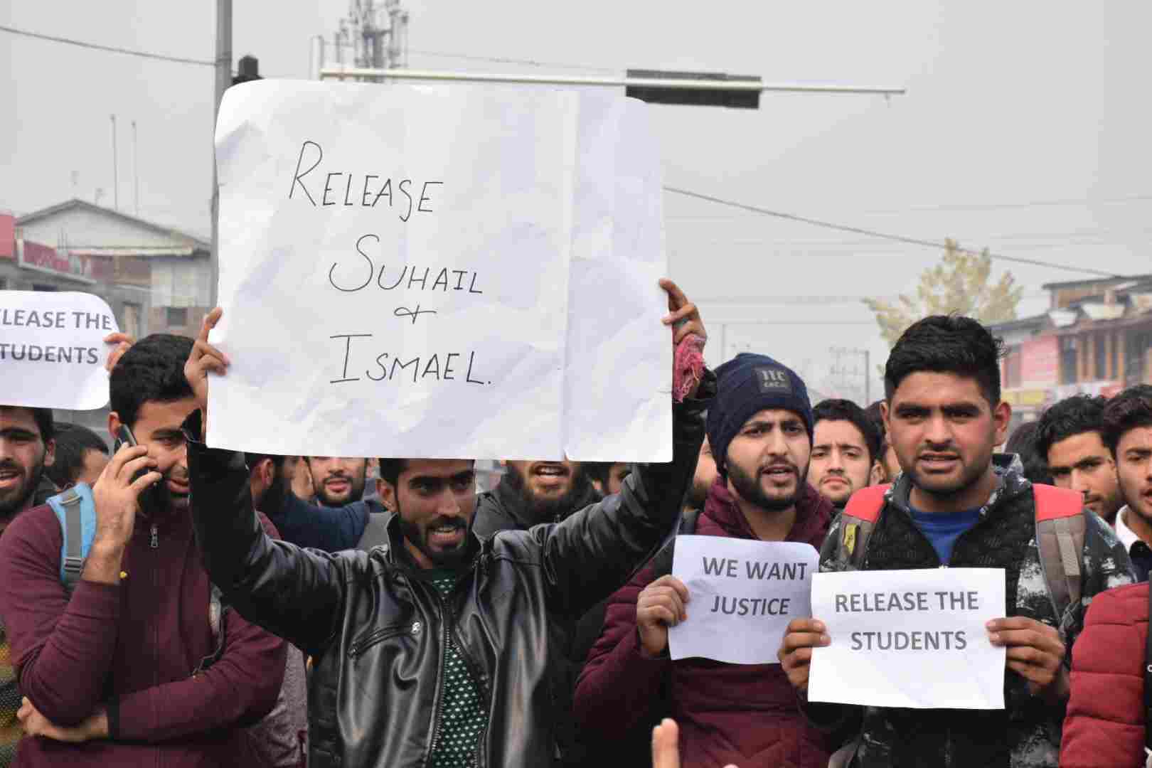 Carrying banners and placards which read “Release our brothers Suhail and Ismail”, the slogan-shouting students assembled at the Press Enclave here today and staged a protest demanding “unconditional” release of both detainees.