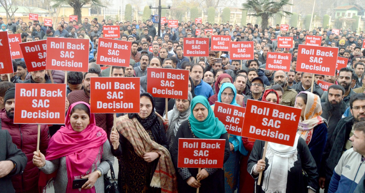 Employees of JK Bank staged a protest demonstration in Srinagar demanding rolling back of SAC decision. Photo: Javid Khan