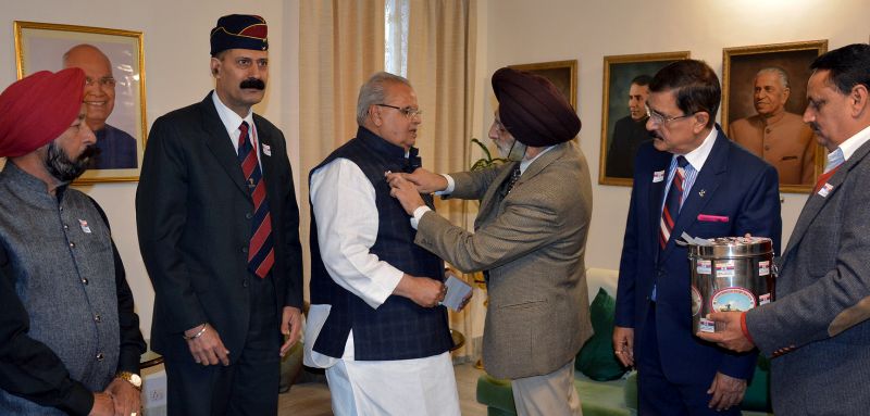 JAMMU, DECEMBER 7: Governor Satya Pal Malik celebrated the Armed Forces Flag Day at a function held at the Raj Bhavan here today. Brig. (Retd.) Harcharan Singh, Director, Rajya Sainik Board pinned a  token Flag on the self of Governor on the occasion. The Governor made contribution towards the Armed Forces Flag Day Fund.