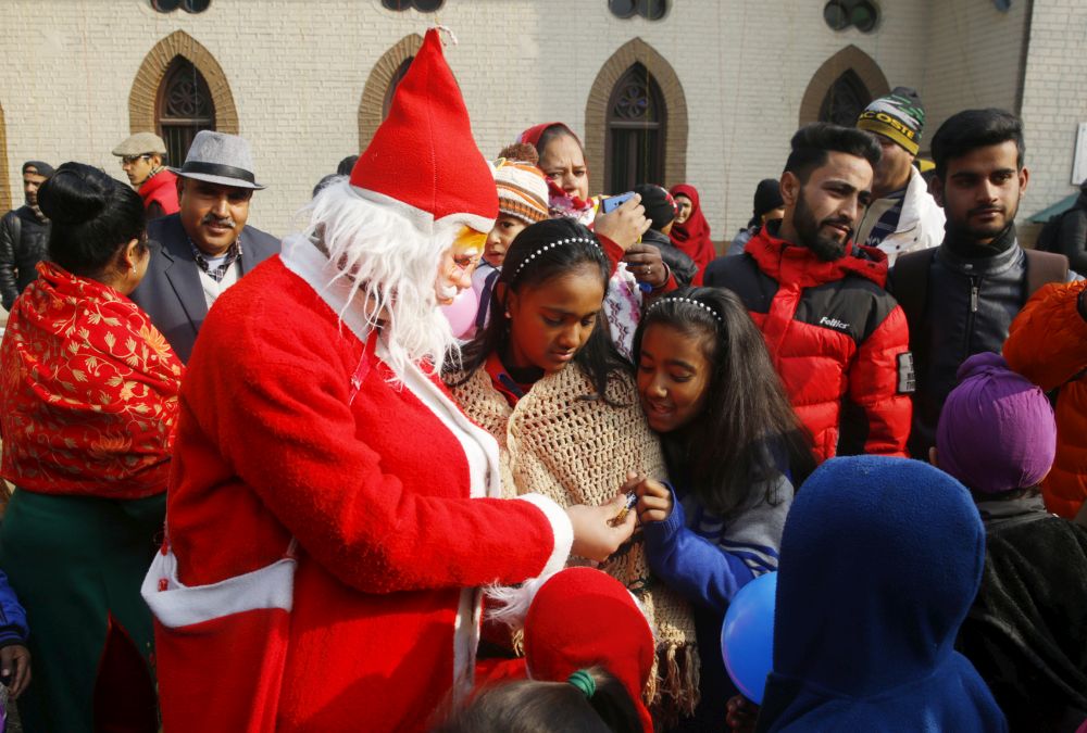 Santa Claus distributes gifts among children who had assembled at Holy Family Catholic Chrch, M A Road Srinagar to celebrate Christmas. Photo/Javed Khan