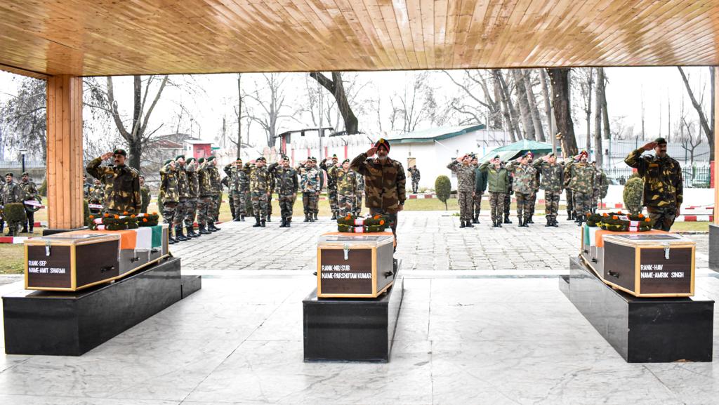 Srinagar: Army today, paid rich tributes to Late Nb Sub Parshotam Kumar, Late Hav Amrik Singh, and Late Amit Sharma, who had made supreme sacrifice while performing an operational task in Machhal Sector, Kupwara on Jan 10, 2023.