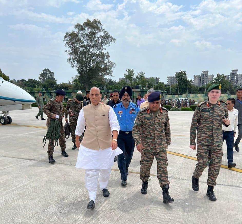 An official told the news agency—Kashmir News Observer (KNO) that Rajnath Singh landed in Jammu today where he was received by Army Chief Manoj Pande and Lt Governor Manoj Sinha