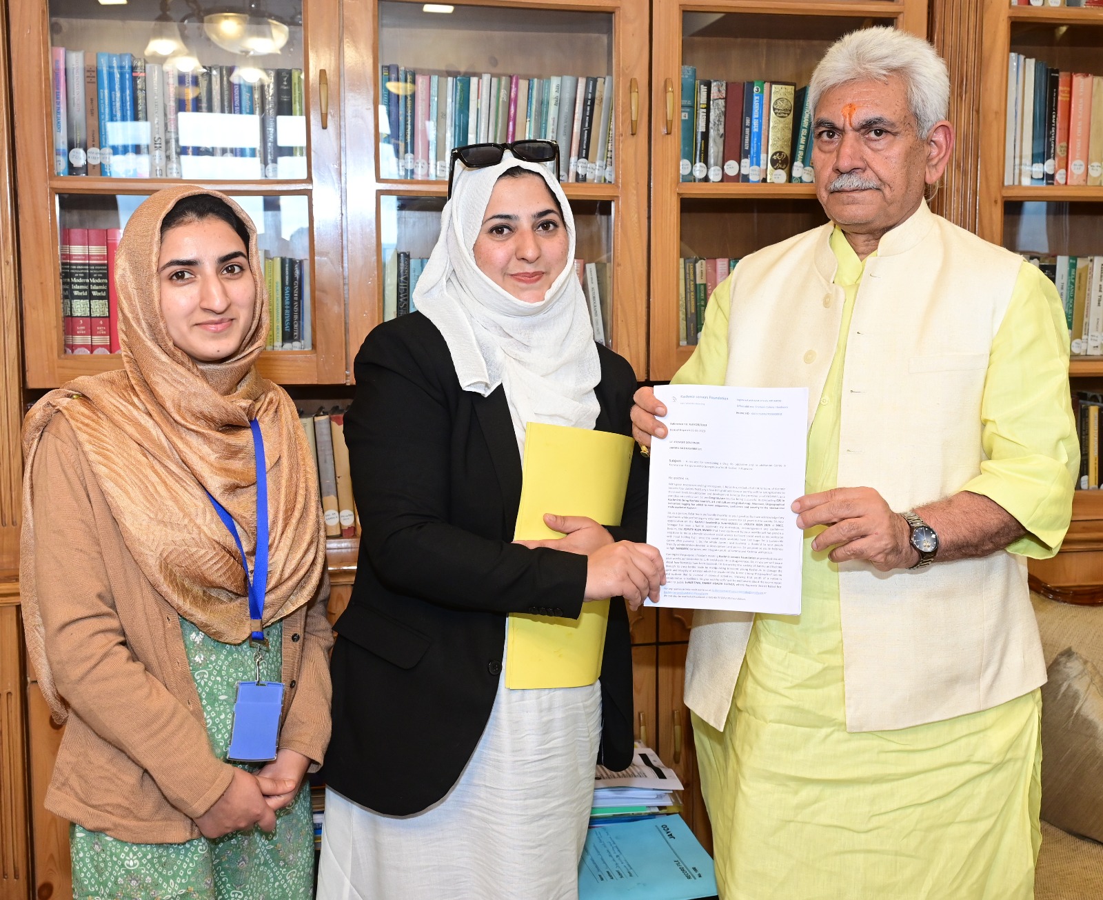 Srinagar: Refat Wani, Chairperson of Kashmir Servers Foundation (NGO) called on Lieutenant Governor Manoj Sinha, at Raj Bhawan today.