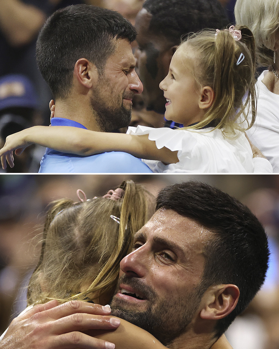 When it was over, Medvedev tapped Djokovic on the chest as they talked at the net. Djokovic flung his racket, put his arms up and then knelt on the court, head bowed. Then he found his daughter for a hug. His son and wife came next, along with his parents and his team.