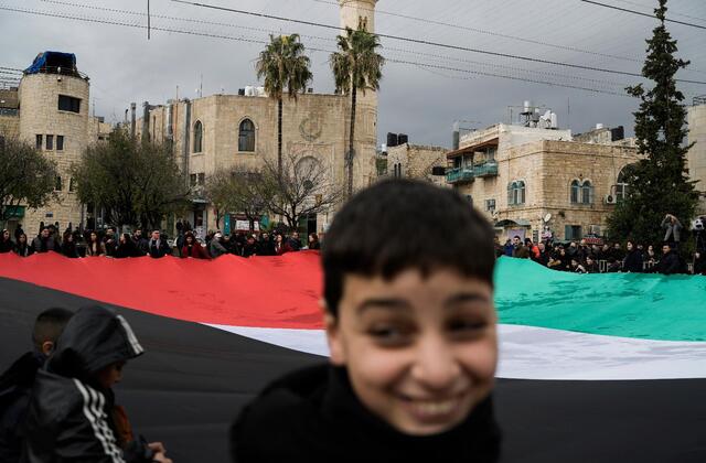 Under a banner that read “Bethlehem’s Christmas bells ring for a cease-fire in Gaza,” a few teenagers offered small inflatable Santas, but no one was buying. Instead of their traditional musical march through the streets of Bethlehem, young scouts stood silently with flags. A group of local students unfurled a massive Palestinian flag as they stood in silence.