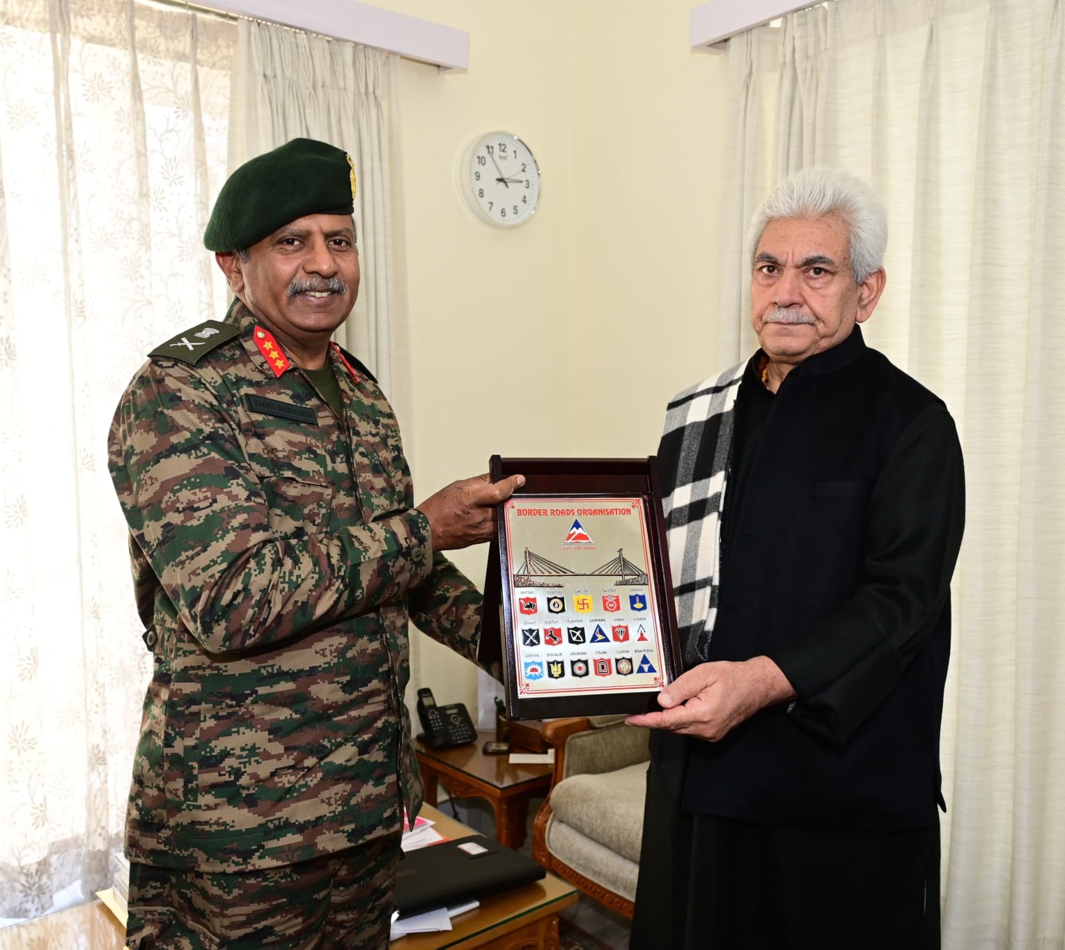 Jammu: Lt Gen Raghu Srinivasan, Director General Border Roads Organisation (BRO) called on Lieutenant Governor Manoj Sinha at Raj Bhawan today.