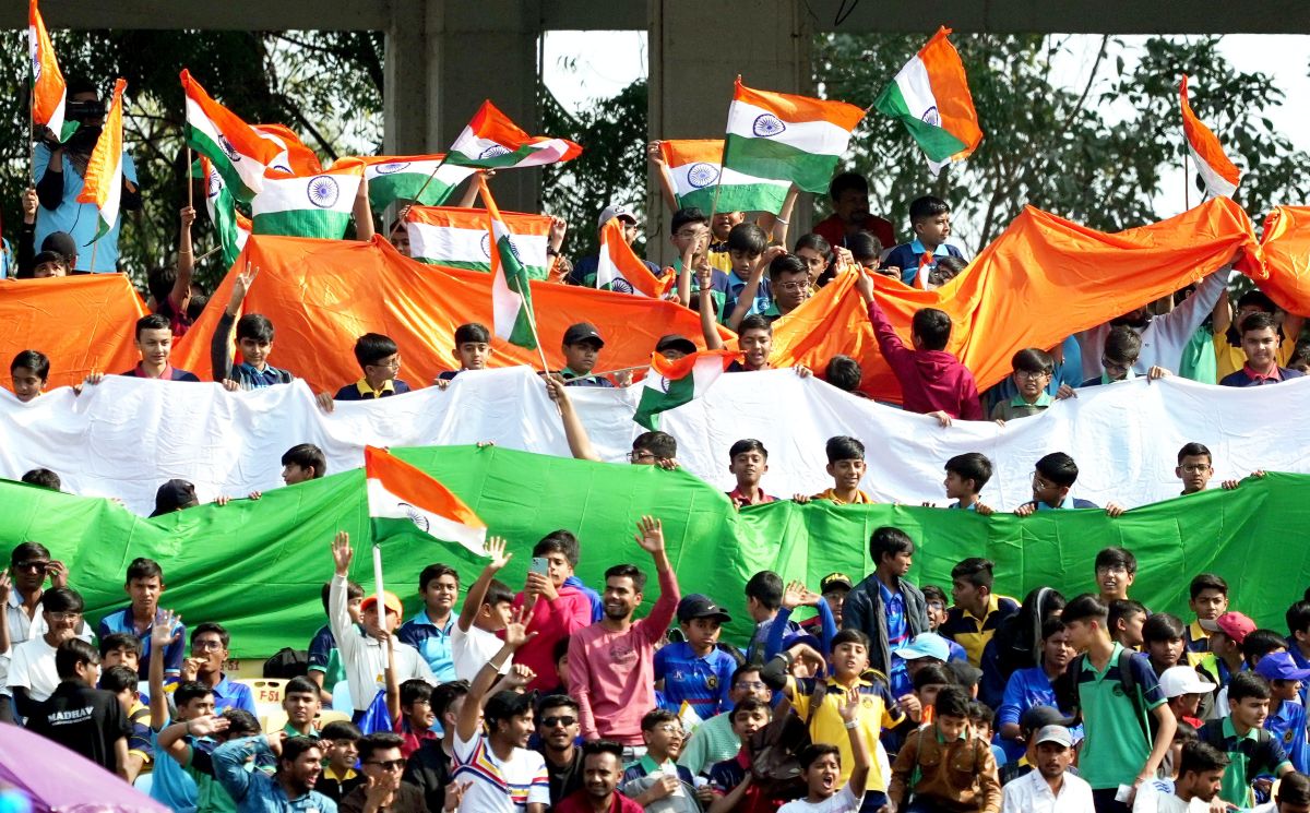 Rajkot: Indian fans cheer up on the first day of the third cricket test match between India and England, at Niranjan Shah Stadium, in Rajkot, Thursday, Feb. 15, 2024. (PTI Photo/Kunal Patil) (PTI02_15_2024_000078A)