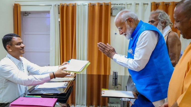 Sporting a white kurta-pajama and a blue sadri, Modi reached the district collectorate after a busy morning, which included an aarti on the banks of the Ganga at the Dashashwamedh ghat and prayers at the city’s Kaal Bhairav temple.