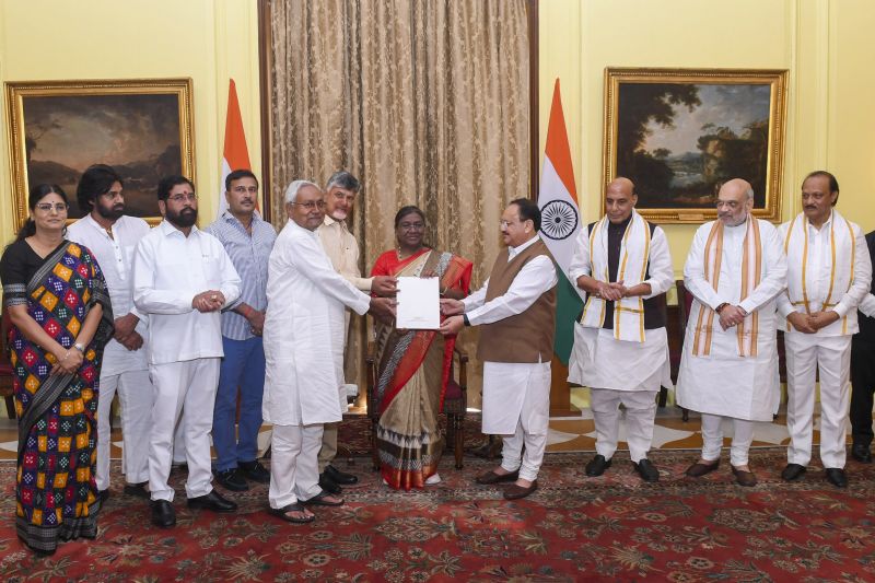 The NDA delegation that called on Murmu was led by Nadda and included Rajnath Singh, Amit Shah, Ashwini Vaishnaw and C N Manjunath (all from the BJP), TDP chief N Chandrababu Naidu, JD(U) leaders Nitish Kumar, Rajiv Ranjan Singh and Sanjay Jha, Shiv Sena chief Eknath Shinde, JD(S) leader H D Kumaraswamy, LJP(RV) leader Chirag Paswan, HAM(S) leader Jitan Ram Manjhi, Jana Sena leader Pawan Kalyan, NCP leader Ajit Pawar, Apna Dal(S) leader Anupriya Patel, RLD leader Jayant Chaudhary, UPPL leader Joyanta Basumatary, AGP leader Atul Bora, SKM leader Indra Hang Subba, AJSU leaders Sudesh Mahto and Chandra Prakash Choudhary and Ramdas Athawale from the RPI(A).
