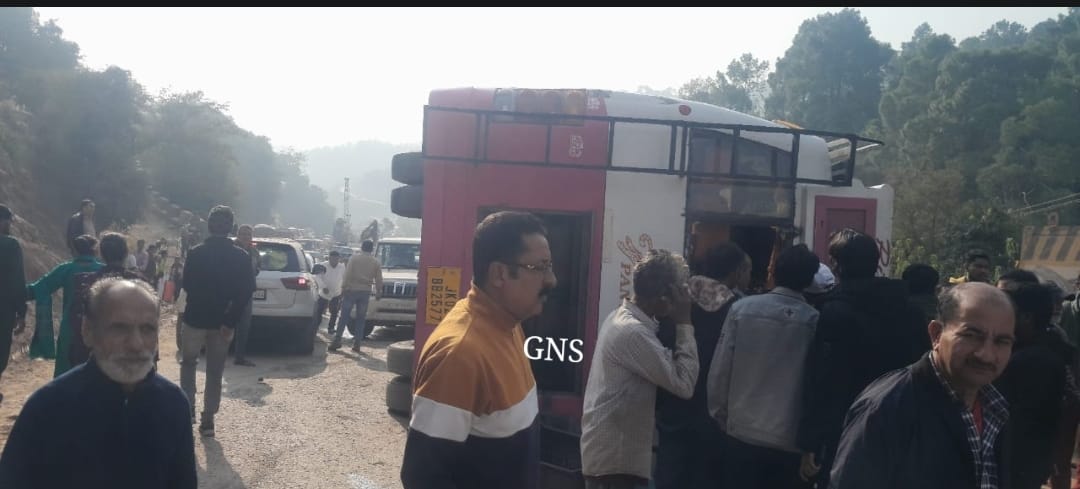 Officials told GNS that a bus bearing registration number JK-02BB- 2577 on its way from Katra towards Jammu turned turtle at Myari bridge resulting injuries to seven people.