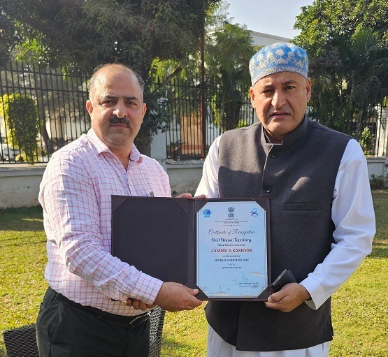 Director Fisheries, J&K, Abdul Majid Tak received the awards, which included a trophy and a certificate of merit for achieving the first position as the best performing Union Territory among all UTs in the country. The department also received the best-performing district award for the Kulgam district. These awards were conferred on November 21, 2024, on the occasion of World Fisheries Day, celebrated at the national level in New Delhi.