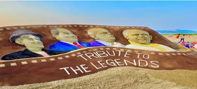 A striking sand art illustration by Padma Shri awardee Sudarshan Pattnaik at Miramar Beach symbolized the cultural impact of these cinematic greats. The Padmashri awardee’s captivating sand art mesmerized public at the beach and stood as a homage to the timeless influence of these four icons.