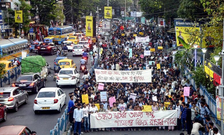 The students’ demands include registering a hit-and-run case against education minister Bratya Basu, whose car allegedly hit Indranuj Roy, a student currently undergoing treatment.