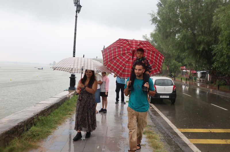 Holding umbrellas, people walk on Boulevard along the banks of Dal Lake as rains lashed Srinagar for several hours on Monday. Photo: Farooq Javed