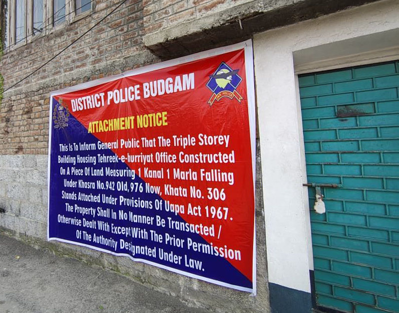 A team of police officials from nearby Budgam put up a board on the wall of the Tehreek-e-Hurriyat office at Hyderpora, announcing the attachment of the building, the officials said.