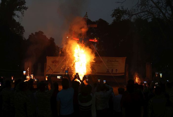 Giant effigies of Ravana, Kumbhakaran and Meghnad were set afire at the practice grounds of the cricket stadium amidst thunderous cheers from the people assembled there, officials said.