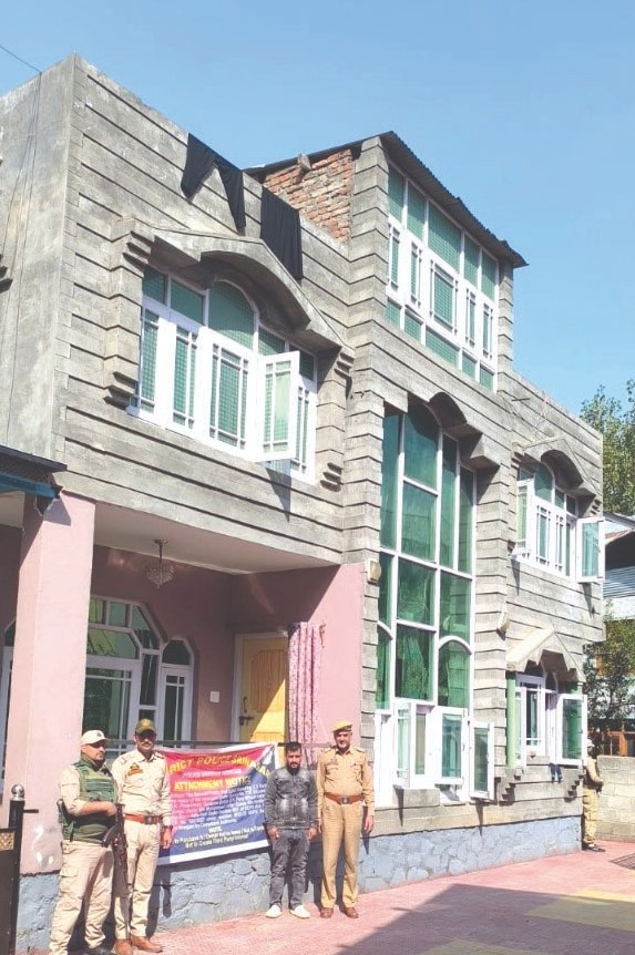 According to police, two single-storey residential houses valued at approximately ₹18 lakh were attached in Pampore. The properties belong to Muzaffar Ahmad Shalla, son of Gull Mohammad Shalla, a resident of Karewa Jablipora, Bijbehara, and Javid Ahmad Ganie, son-in-law of Late Ali Mohammad Rather, a resident of Gund Baba Khalil, Naina Sangam.