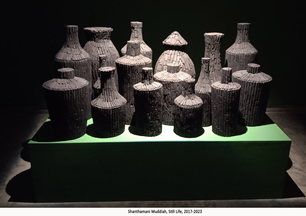A similar resistance to narrative appears in Shanthamani Muddiah’s still life composed of charcoal sticks. While the artist has spoken of the work as a comment on carbon emissions, Rajendar Tiku situates it within the history of art rather than external discourse. For him, the work resonates with the quiet intensity of Giorgio Morandi’s still lifes, which seem to solidify time itself. The charcoal forms evoke a sense of suspension and aftermath, recalling images that emerge from historical trauma rather than environmental slogans.
