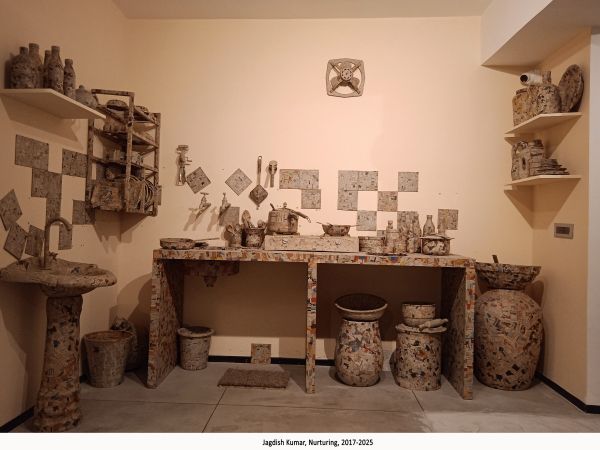 Jagdish Kumar’s paper sculptures introduce a different kind of material poetry. His meticulously crafted kitchen, made entirely of newspaper and without any internal armature, blurs the line between illusion and function. In Kumar’s practice, everyday objects—bread, utensils, cookware—are transformed into acts of quiet magic. His work is playful yet rigorous, empathetic yet technically astonishing. The kitchen, often described as the centre of life, becomes here a meditation on care, labour, and the extraordinary possibilities of an ordinary material.